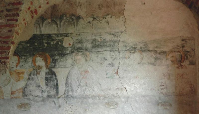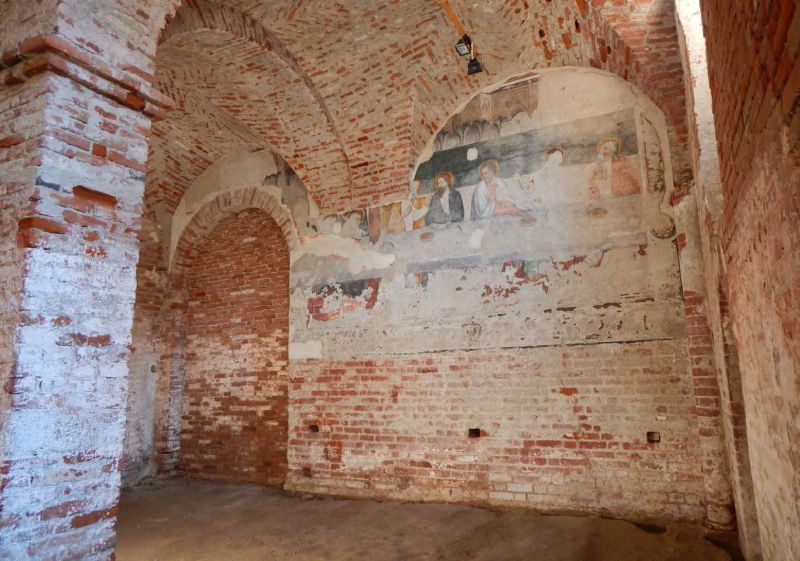 Sulla parete interna del refettorio, rivolta ad est, si distingue, estesa, la superficie occupata da un affresco, una veduta raffigurante “l’Ultima Cena”, dipinta con toni policromi e certamente attribuibile alla fase storica precedente alle trasformazioni architettoniche del vano (sec. XVI), a seguito della battaglia di Catinat. L’affresco parte da una quota di circa 2 metri e arriva all’apice della parete attualmente visibile e, considerate le dimensioni, probabilmente occupava l’intera parete. Ben si evidenziano tre figure, tra cui il Cristo, e appena si intravvedono le tracce di altri tre apostoli.