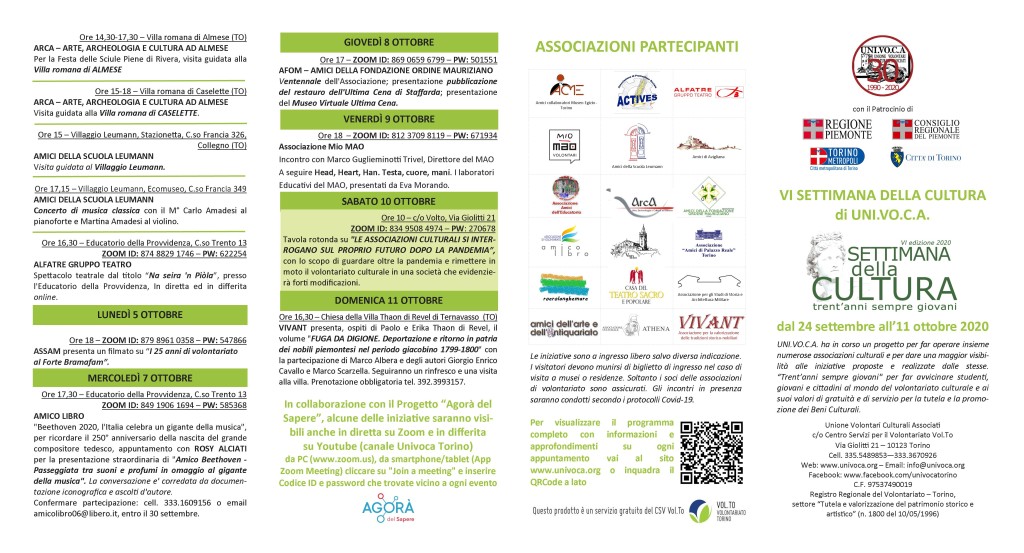 Per informazioni sulle singole iniziative e per acquisire le coordinate per i collegamenti online sulla piattaforma ZOOM vedere l’allegato depliant oppure andate sulla pagina facebook www.facebook.com/univocatorino oppure scrivere a info@univoca.org